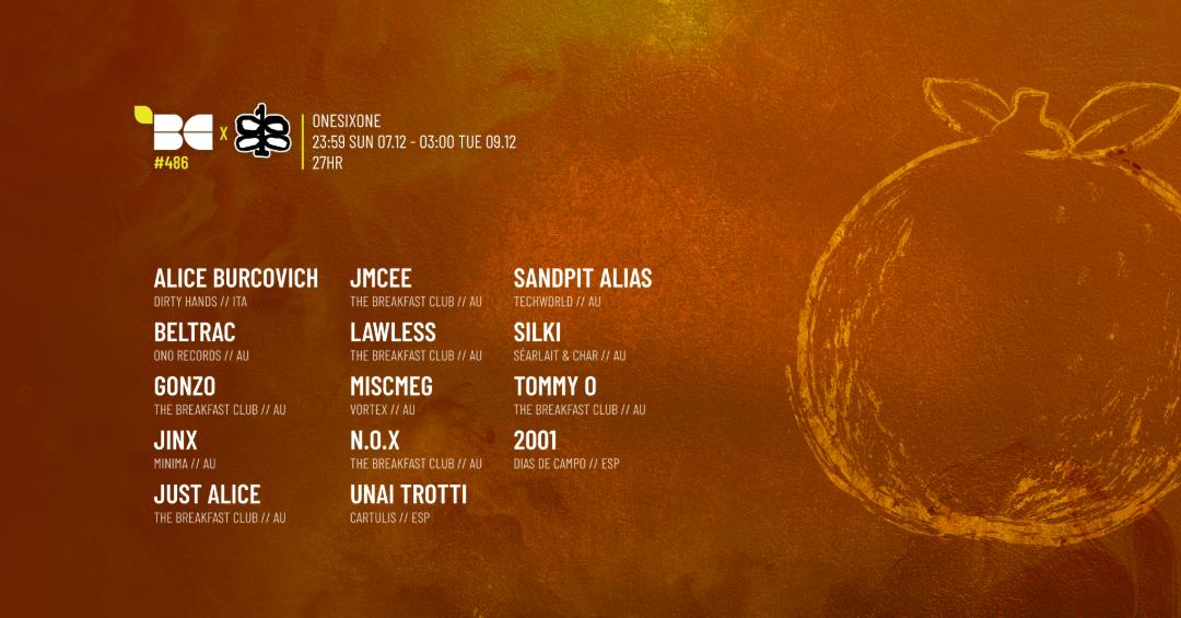 This week: Alice Burcovich (Dirty Hands // ITA) Beltrac (ONO Records // AU) Gonzo (The Breakfast Club // AU) Jinx (Minima // AU) Jmcee (The Breakfast Club // AU) Just Alice (The Breakfast Club // AU) Lawless (The Breakfast Club // AU) Miscmeg (Vortex // AU) N.O.X (The Breakfast Club // AU) Unai Trotti (Cartulis // ESP) Sandpit Alias (Techworld // AU) Silki (Séarlait & Char // AU) Tommy O (The Breakfast Club // AU) 2001 (Dias De Campo // ESP)