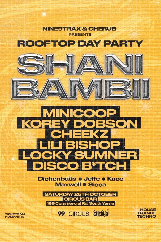 Leading the lineup are SHANI and BAMBII, supported by an outstanding mix of local talent: Cheekz, Dichenbaüs, Disco B*tch, Jeffe, Kace, Korey Dobson, Lili Bishop, Locky Sumner, Maxwell, Minicoop, Sicca.