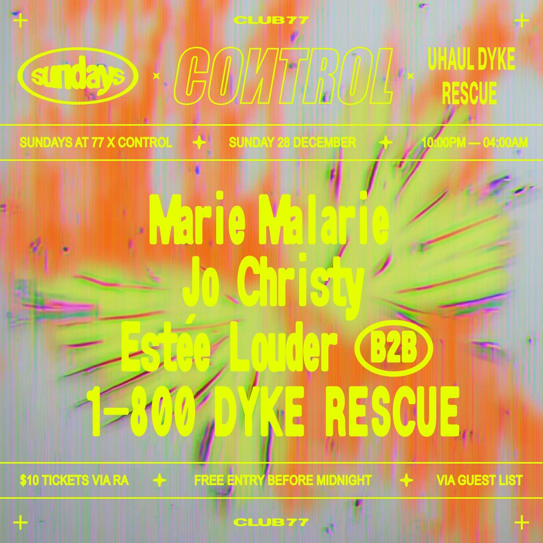 Events Sundays at 77 x Control: Marie Malarie, Jo Christy, Estée Louder x 1-800 Dyke Rescue 10:00 PM, 28 Dec 2025