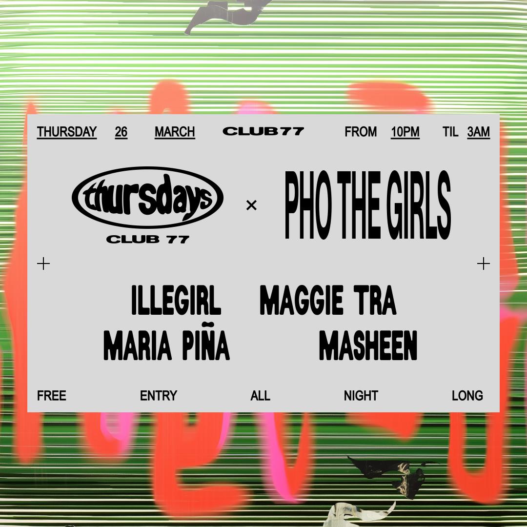 Events Thursdays at 77 x Pho the Girls: Illegirl, Maggie Tra, Masheen, Maria Piña 10:00 PM, 26 Mar 2026