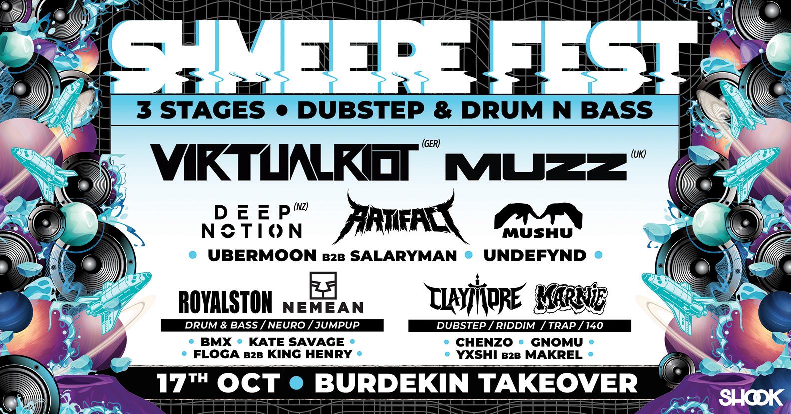 SHOOK is over the moon to announce SHMEERE FEST featuring an insanely stacked lineup of local and international bass artists over 3 STAGES at the Burdekin hotel.