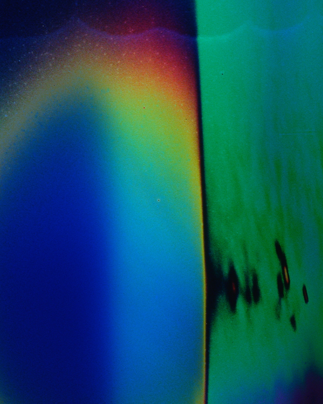 What this meant was that even though there was limited light while we were shooting, through this solarisation process, I could alter the image midway through hand development and give it light at specific points, which creates this solarisation halo effect around the edges of distinguishable figures in the film itself. The film is a double solarised experiment, meaning that I solarised the film stock I ran through the camera, which I treated as the ‘negative’ and then solarised the master print ‘positive’ that I made through a contact printer.