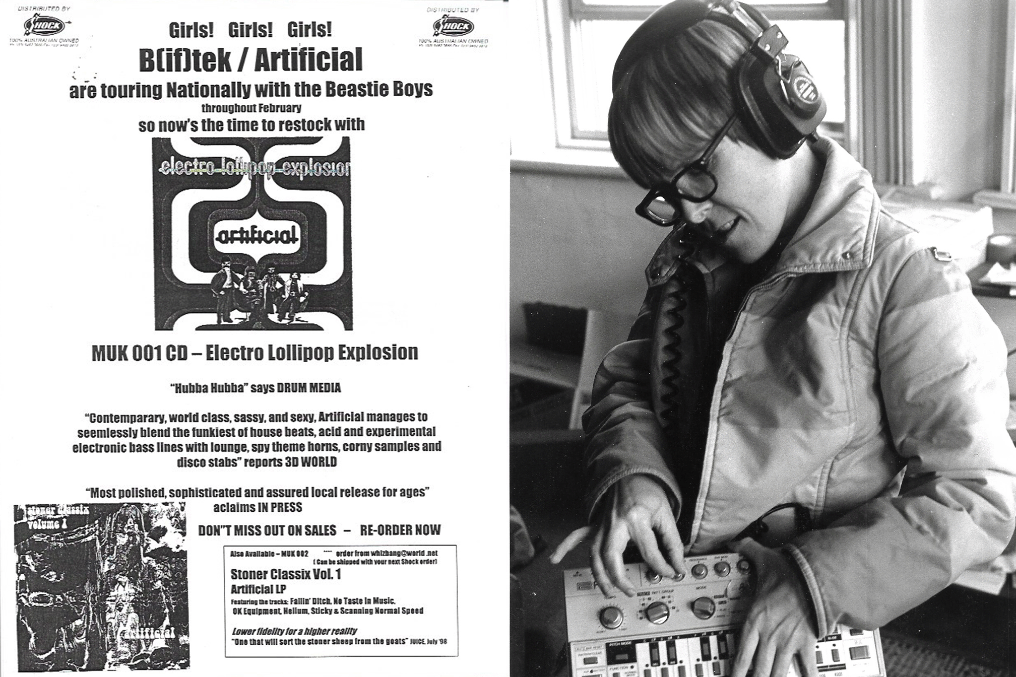 LEFT: ARTIFICIAL 'STONER CLASSIX VOL 1' PRESS RELEASE, 1999 - RIGHT: ARTIFICIAL (WITH 303 ACID MACHINE), 1998