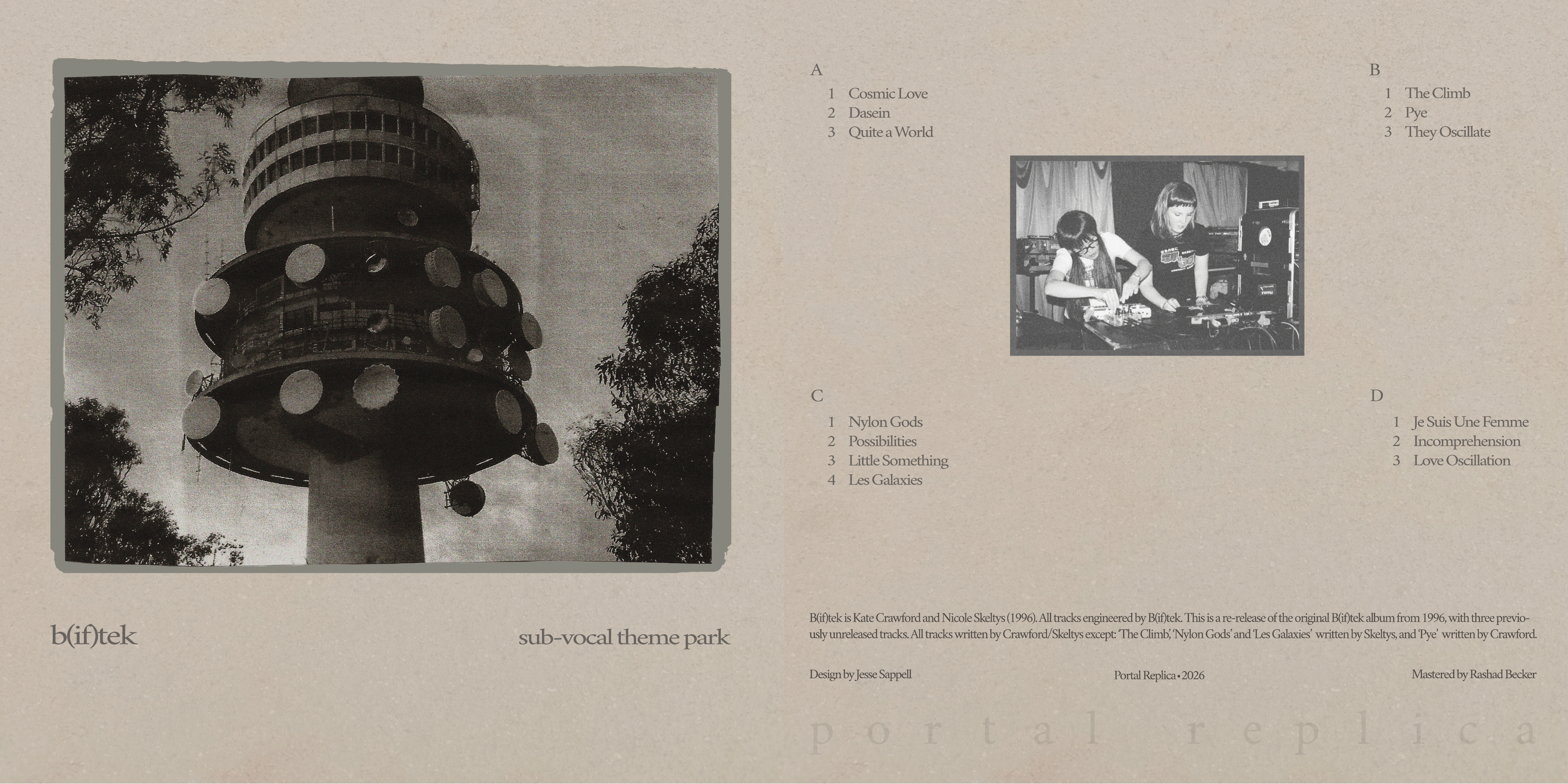 The reprint has been reissued with a new artwork, designed by Motionward’s Jesse Seppell. It features Kate Crawford’s photograph of Canberra’s old Telecom tower on the front and a photo of B(if)tek playing live in Melbourne in 1998 on the back. The record is a culmination of cherished, heavy-hitting dance tracks, like ‘Cosmic Love’ with melodic, overdubbed recordings that echo the intimacy of a well-appointed morning kick-ons.